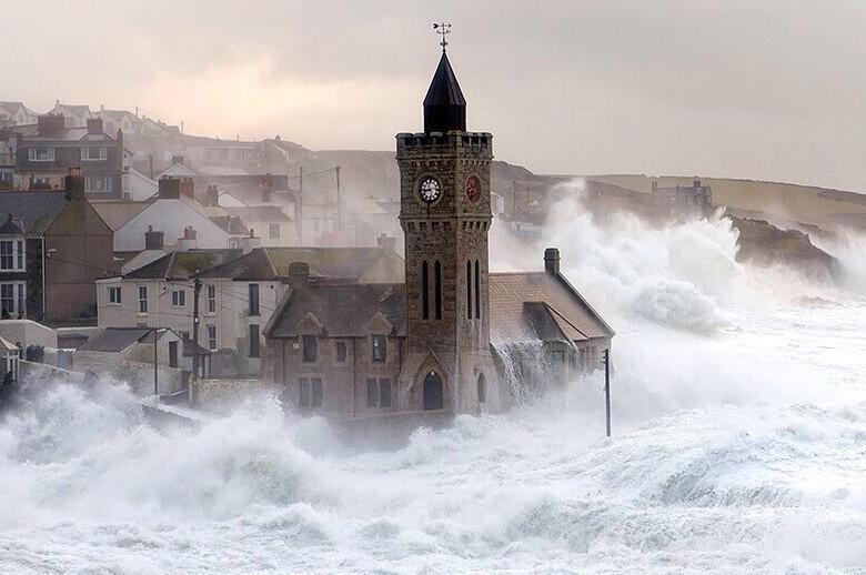 Foto Lloyd W.A. de Porthleven, Devon. Església amenaçada, poble amenaçat, onades perverses.